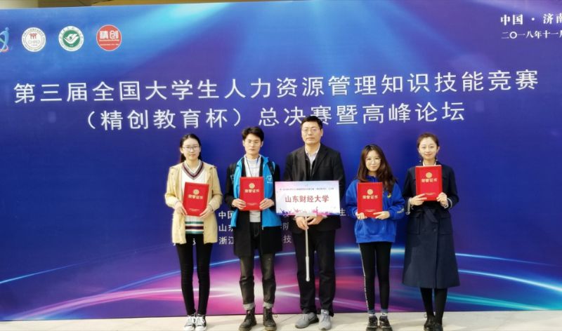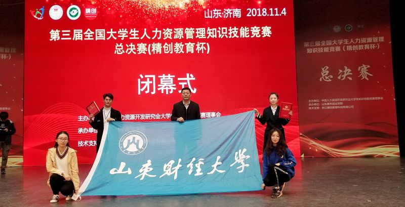 11月3日至4日,“第三届全国大学生人力资源管理知识技能竞赛总决赛暨高峰论坛”在山东青年政治学院举行,本次大赛由中国人力资源开发研究会主办,山东青年政治学院承办,浙江精创教育科技有限公司协办,由7个本科组大区、2个高职组大区中晋级的81支队伍参加,参赛师生达到600余人。我校人力资源管理专业4名同学组成的代表队经过近8个时不间断的激烈角逐,最终获得国家二等奖、最具潜力奖。