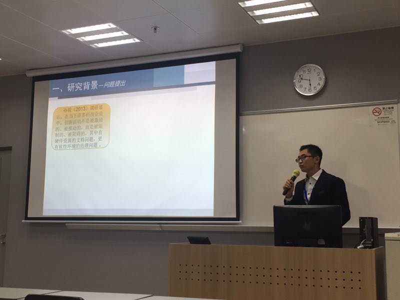 研究生李树文在分会场第二会场第七组“个人特质与工作结果”专题进行了论文报告,报告题目为《组织情绪能力对产品创新绩效的影响-企业生命周期的实证研究》。报告内容主要分为五部分,分别是研究背景与意义、研究内容与框架、研究创新点、研究结论、研究不足与展望。会场上获得了各高校师生具有建设性的学术意见与建议,会后与南京大学张正堂教授、中山大学赵新元教授进行了深度交流。