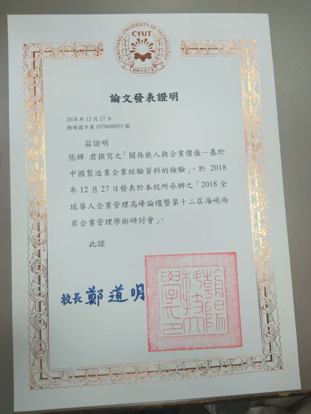 张辉同学于2018年12月26日-30日赴中国台湾朝阳科技大学参加“2018全球华人企业管理高峰论坛”,该论坛每年举办一次,是海峡两岸重要的学术沟通平台。本次论坛的主题是“智慧时代的企业创新”,分设了创新模式、组织创新与人资管理、行销管理、流通管理、金融科技、休闲管理、旅游管理、东方管理、电商管理、科技管理及其它有关议题。交流会上,张辉同学就申请并参加的麻豆网