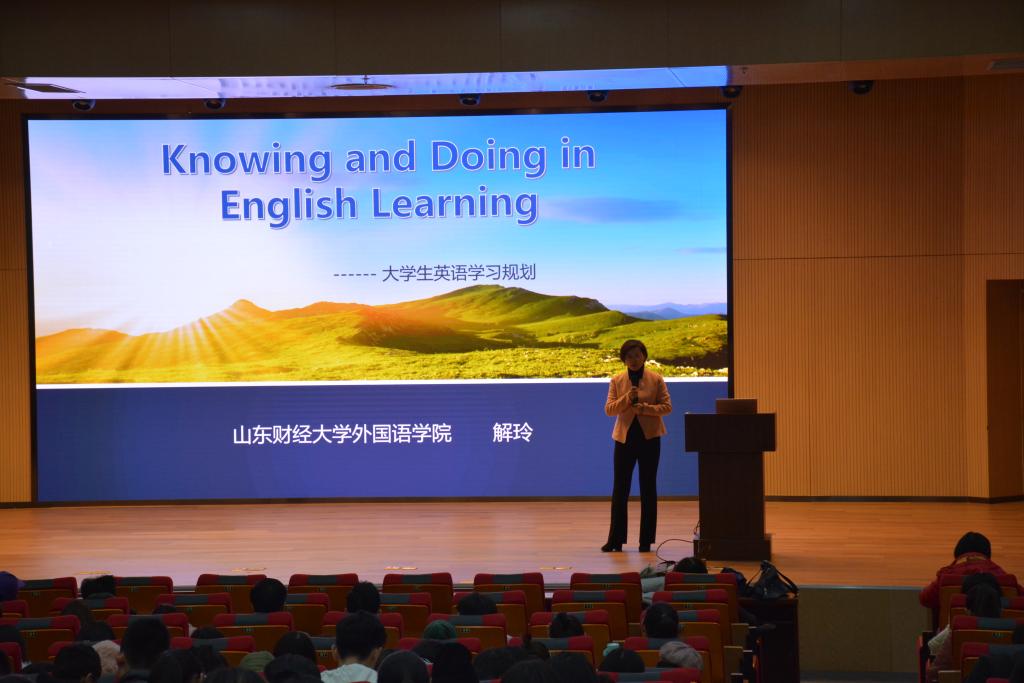 学子的美好希望展开本次讲座。在讲座中,解玲首先讲述了外语的起源,从“appalling numbers” 、“interesting English”和“beautiful English”三个方面详细地阐述了大学生应有的单词量、英语的趣味性以及英语的美,启发学生们应发现英语学习的乐趣,而不是死学英语。解玲通过现场跟读的互动模式与视频讲解纠正了当今大学生对“记单词、练听力、提口语、写作”四个方面的偏见,并分别从以上四个方面提出了有效的学习方法。最后,解玲介绍了多种含金量高的英语考试与赛事,为同学们的大学英语学习提供了努力的方向。