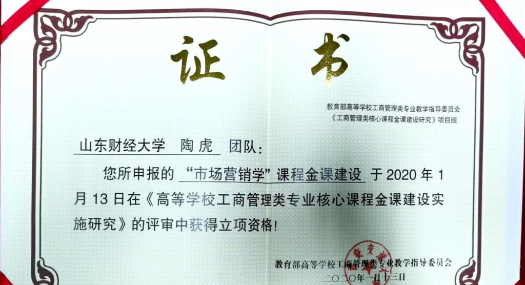 陶虎教授团队申报的《市场营销学》课程金课建设项目在《高等学校工商管理类专业核心课程金课建设实施研究》的评审中获得立项资格。本项目是教育部高等学校工商管理类专业教学指导委员会在全国高校推行工商管理类“一流专业、一流金课”课程建设研究计划的核心课题之一。