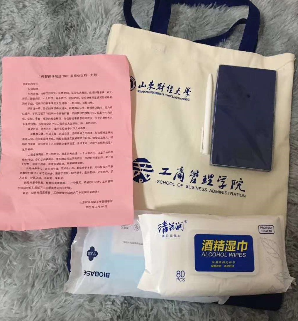 同学们纷纷表示,这是他们收到的最暖心的毕业礼物,心中满满的都是惊喜与感动。2016级人力资源管理1班的董天宇说:“ 路上注意安全,乘坐公共交通工具有风险,一定要戴好口罩,接触把手前先拿湿巾擦一擦。总想着送你们些什么,但还是觉得消毒湿巾和口罩用得上,还有学院的本子和笔,是学院的心意。李书记的嘱托一直萦绕在耳畔,老师们的身影,好像家人在身旁,给我们这些异乡的学子依靠。多么希望时光能再慢一些啊,留住那些感动的、喜悦的、无比快乐的时光,可路还要继续走下去。我会带着老师们的祝福与期望,勇敢地奔赴下一场征程!”“四年前,我们步入莱芜校区,成为商经学院的一分子,一年前我们自莱芜来到麻豆网