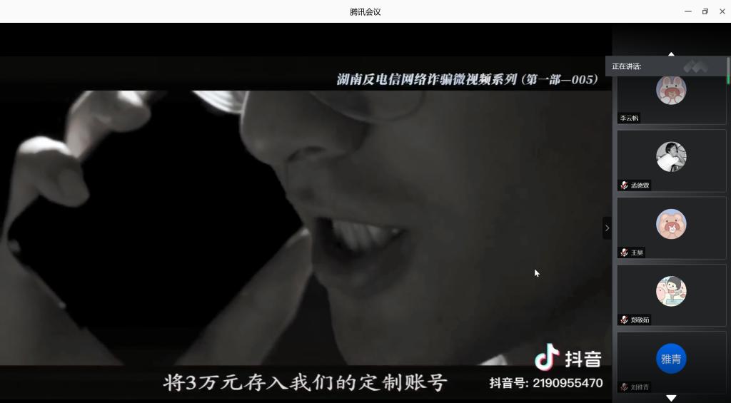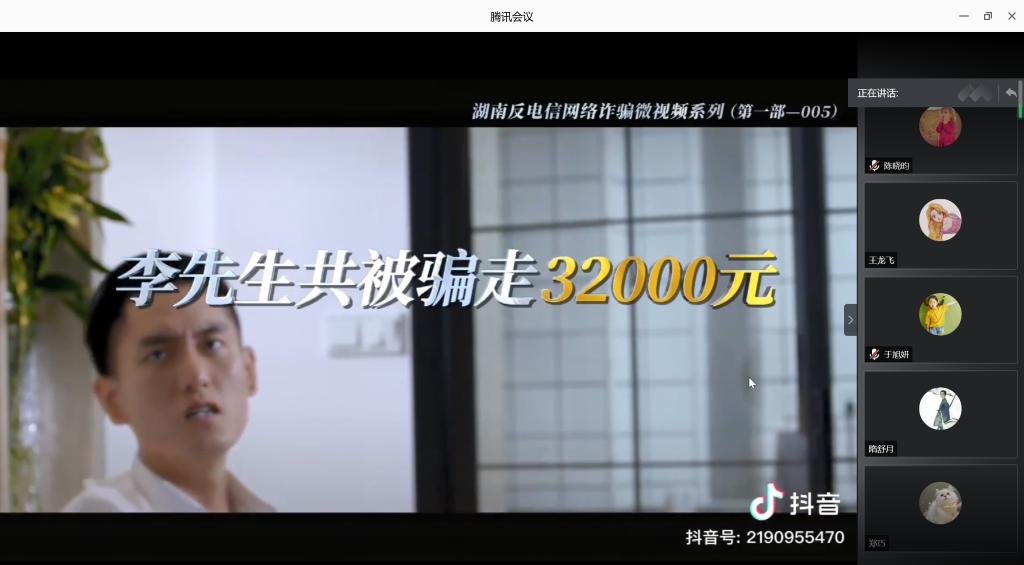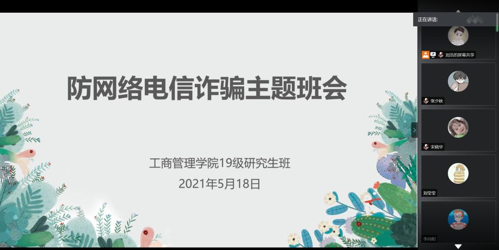 研究生20级同学在教室、18级和19级同学通过腾讯会议的形式,分别组织全体同学观看学习了网络电信诈骗的典型案例,防范电信网络诈骗的视频。各班班长向同学们介绍了网络诈骗的含义、特点及其危害,并结合视频讲解了网络诈骗的常见形式、如何防范网络诈骗等。