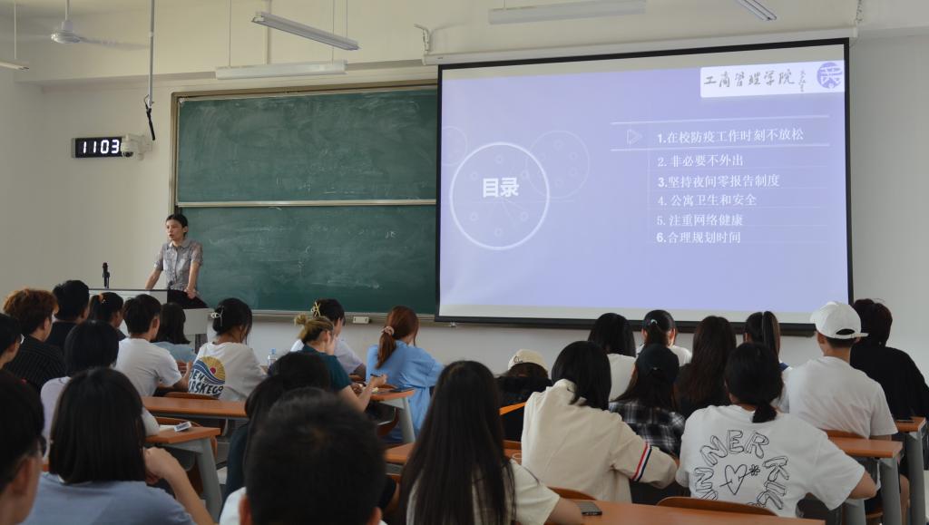 本次“开学第一课”主题班会主要从防疫工作、公寓管理、防范诈骗、遵守校规校纪以及军训五大方面入手,全面介绍了学校的工作安排。两位辅导员立足学生生活学习的实际,结合自己多年的带班经验,利用生动形象的事例为21级新生敲响了安全的警钟。在防疫方面,辅导员强调了防疫工作的常态化,叮嘱21级新生佩戴口罩、有情况及时报告以及非必要不要外出,再一次让21级新生提起防疫警惕性。