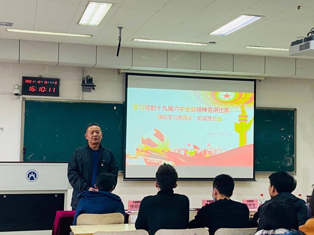 韩作生充分肯定了同学们的精彩表现,结合对参赛选手的点评又深入地对党的十九届六中全会精神进行了宣讲,他指出要认真学习和贯彻落实好党的十九届六中全会精神,准确把握“两个确立”的决定性意义,把“两个确立”转化为做到“两个维护”的思想自觉、政治自觉、行动自觉。要统一思想、凝聚共识、汇聚力量,听党话、感党恩、跟党走,在提升思想中坚定理想信念,践行使命担当;要以史为鉴、开拓未来、不忘初心、牢记使命,厚植爱国主义情怀,把爱国情、强国志、报国行自觉融入坚持和发展中国特色社会主义事业中。要积极应对新形势、新挑战、新使命,在传承和创新中不断提升自身能力,用知识奉献社会,用实践实现价值,在经济社会高质量发展中展现青春英姿、迸发青春活力,为实现第二个百年奋斗目标、实现中华民族伟大复兴而努力奋斗。