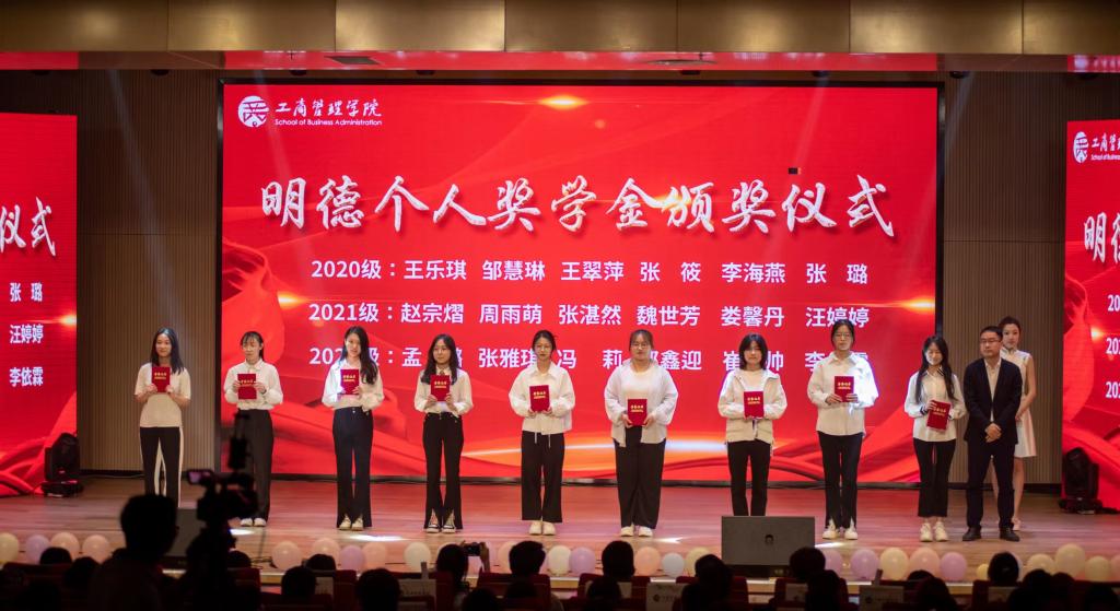 晚会进行第一篇章后,明德物业管理集团的董事副总裁兼首席财务官王成成为获得明德个人奖学金的18名同学、获得学风特优班3个班级进行颁奖。
