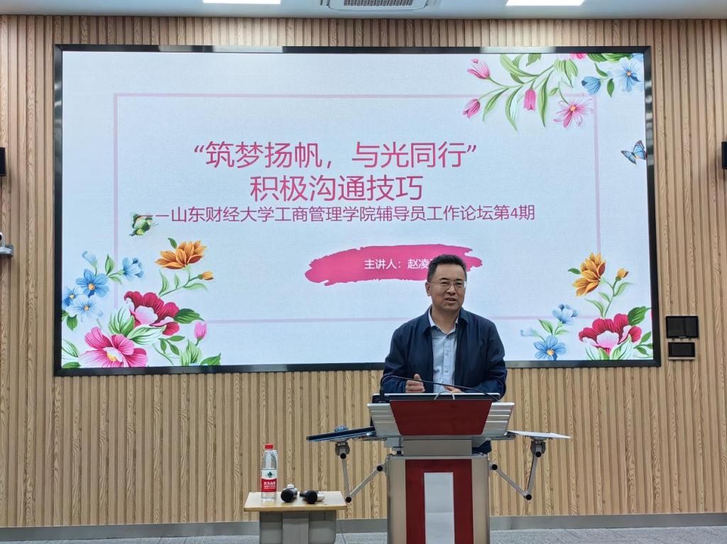在燕山校区逸夫楼103教室举办第四期辅导员工作专题报告会,本次报告会以“筑梦扬帆,与光同行”积极沟通技巧为题,邀请山东建筑大学商学院博士、山东省家庭教育宣讲团专家赵凌云主讲。学院党委书记赵世民、副书记彭艳红,侯昭瑾、全体辅导员及班主任老师共同聆听了报告。报告会由赵世民主持。