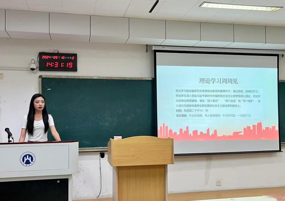 活动伊始,许梦晴就“理论学习周周见”活动进行介绍,此活动是学院加强研究生思想政治教育的重要一环,旨在通过系统化的学习党的理论方针和政策,帮助同学们树立正确的世界观、人生观、价值观,增强同学们的理论素养和责任担当。之后,许梦晴对往期富有成效的理论学习活动进行了精彩回顾。