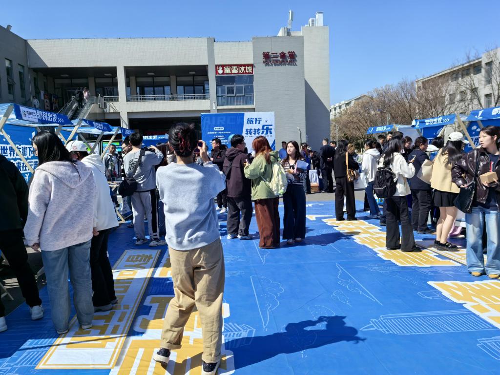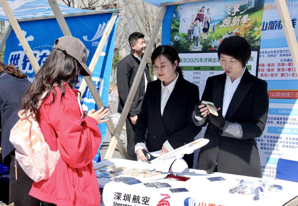 ,以"航空+旅游"为主题搭建校企合作平台。淄博市文化和旅游局通过沉浸式文旅推介,既有传统文化知识竞答、"好客山东·淄博"景区门票减免政策解析,又创新推出春日樱花季赏花专线导览等体验项目,生动展现了"山水淄博"文旅资源禀赋。机场、文旅部门、航司及旅行社多方联动,为师生立体化呈现"航空+旅游"产业链服务,持续激活高校群体航空出行市场新动能。各大航空公司及旅行社针对学生群体推出"机票+酒店"、"往返特惠套餐"等专属产品,让师生以更实惠的价格畅享旅程。此外活动特别设置"飞行模拟体验区""旅游攻略设计赛"等互动环节,同学们在沉浸式体验中规划属于自己的"青春航线"。在“旅行转转乐”游戏区,大家通过掷骰子的方式赢得精美小礼品,近百名师生现场参与。活动现场还发放了定制文创礼包,包含济南机场主题明信片、淄博文旅手绘地图等纪念品。