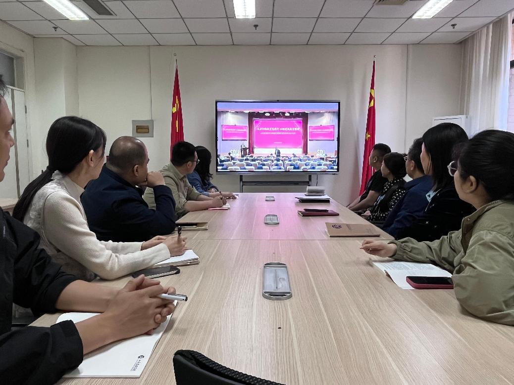 组织全体教职工在线收听收看。党委书记赵世民、院长徐鹏、副书记彭艳红、郑大伟、副院长陈庆江,以及辅导员和办公室行政人员在逸夫楼207会议室集体收看活动。同时组织各系教师以集中与分散相结合的方式在线观看“山东省弘扬教育家精神”活动直播。