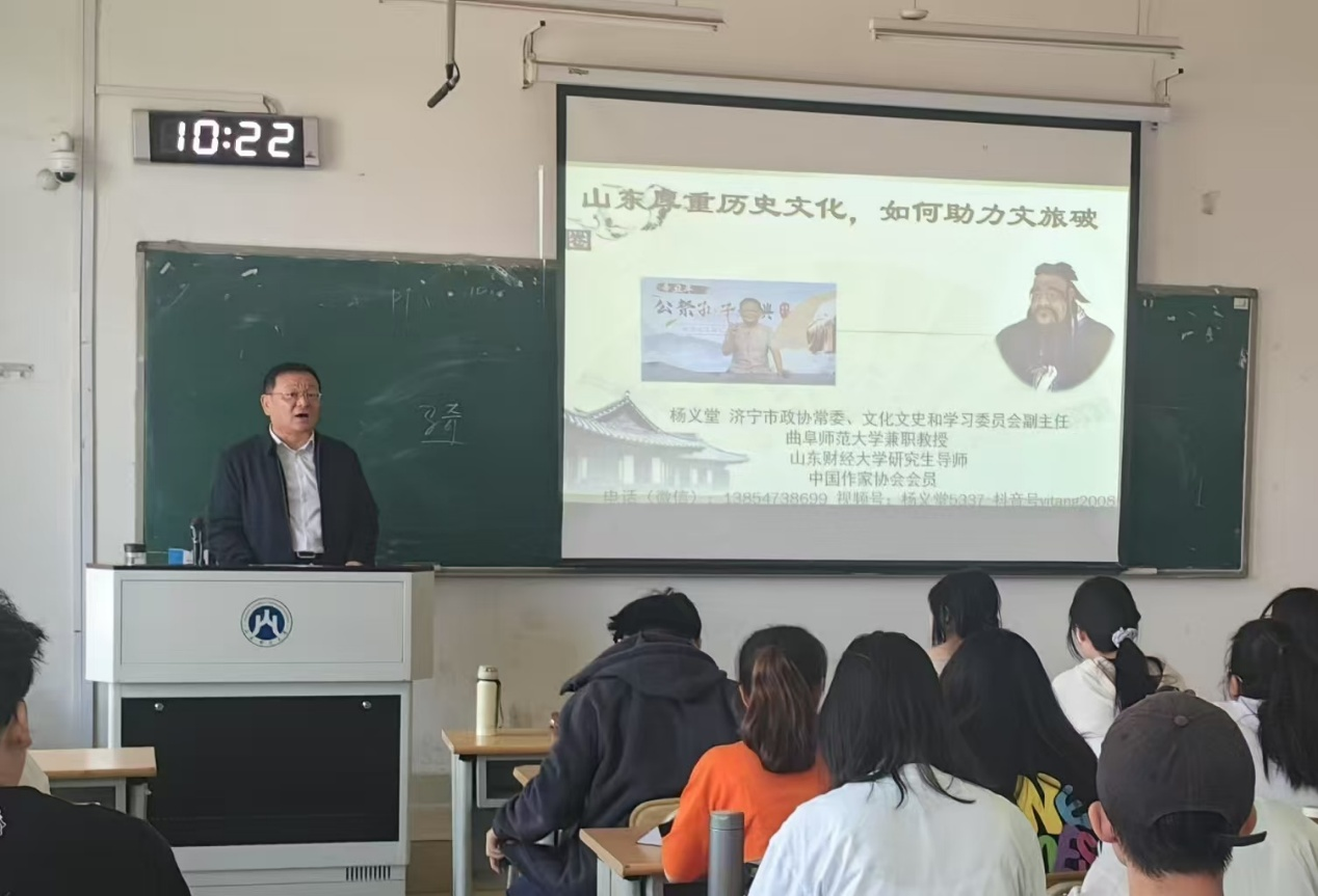 讲坛第23期在圣井校区5-403教室成功举办。济宁市政协常委、著名文化学者杨义堂以“厚重历史文化如何助力山东文旅破圈”为主题,为师生讲解了山东的厚重历史文化沿革。