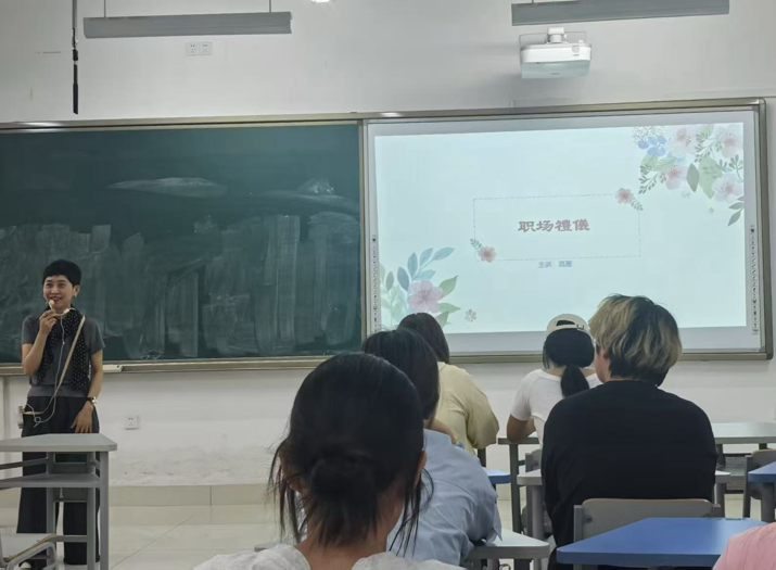 在章丘校区举办大学生职场礼仪专题培训会。山东省文化和旅游厅专职讲师、山东省优秀共享课程《商务礼仪》负责人、中国民主促进会会员、学院文化和旅游系教师高雁担任主讲嘉宾。