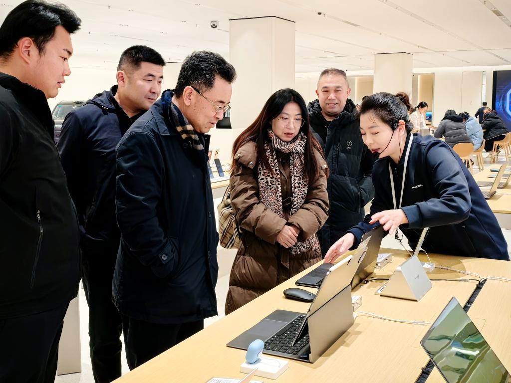 在华为智能生活馆,师生一行在门店经理贾丽颖的引导下,参观了形象展示区,沉浸式体验了手机、电脑、穿戴等全场景智能产品,并对门店运营流程与服务模式进行了深入了解。门店相关人员分别就鸿蒙智行新能源科技创新、Mate系列产品技术亮点等进行了专题讲解与演示,通过华为学堂等形式,生动展现了企业的前沿技术与品牌理念。