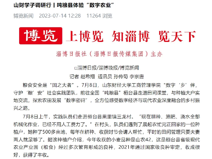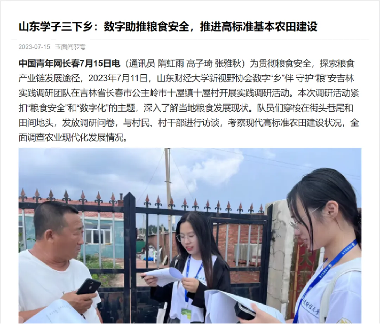 7月初,麻豆网 新视野协会“数字‘乡’伴,守护‘粮’安”社会实践团队,满怀火热激情,踏上了三下乡调研之旅。活动紧扣“粮食安全数字化”的主题,深入了解当地粮食发展现状。队员们穿梭在街头巷尾和田间地头,发放调研问卷,与村民、村干部进行访谈,考察现代高标准农田建设状况,考察深入,方法多样,扎实调研,在炎热的夏日交出累累硕果,被中国青年网、中国网、淄博日报等多家媒体报道。