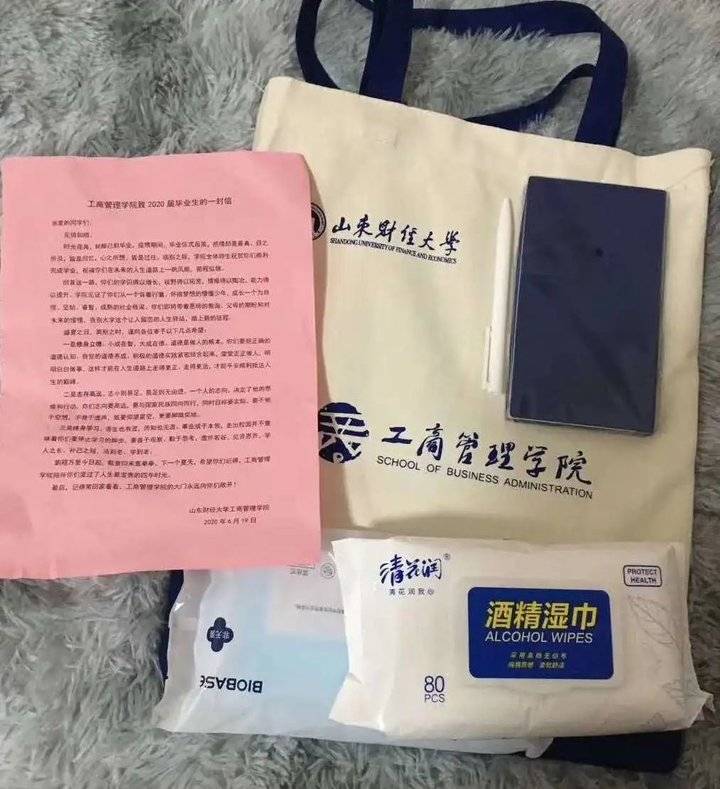 同学们纷纷表示,这是他们收到的最暖心的毕业礼物,心中满满的都是惊喜与感动。2016级人力资源管理1班的董天宇说:“ 路上注意安全,乘坐公共交通工具有风险,一定要戴好口罩,接触把手前先拿湿巾擦一擦。总想着送你们些什么,但还是觉得消毒湿巾和口罩用得上,还有学院的本子和笔,是学院的心意。李书记的嘱托一直萦绕在耳畔,老师们的身影,好像家人在身旁,给我们这些异乡的学子依靠。多么希望时光能再慢一些啊,留住那些感动的、喜悦的、无比快乐的时光,可路还要继续走下去。我会带着老师们的祝福与期望,勇敢地奔赴下一场征程!”“四年前,我们步入莱芜校区,成为商经学院的一分子,一年前我们自莱芜来到麻豆网