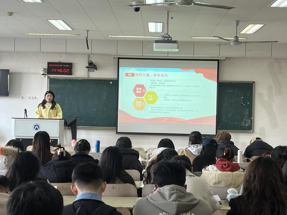 研究生在逸夫楼218教室开启新学期首次“理论学习周周见”活动,辅导员任康老师及全体研究生参加,本次学习主题聚焦党的二十大代表中的“时代楷模”——“最美校长”张桂梅。