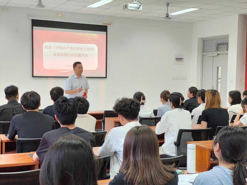 党委书记赵世民在圣井校区8330教室,为学院50余名预备党员讲授党纪学习教育专题党课。