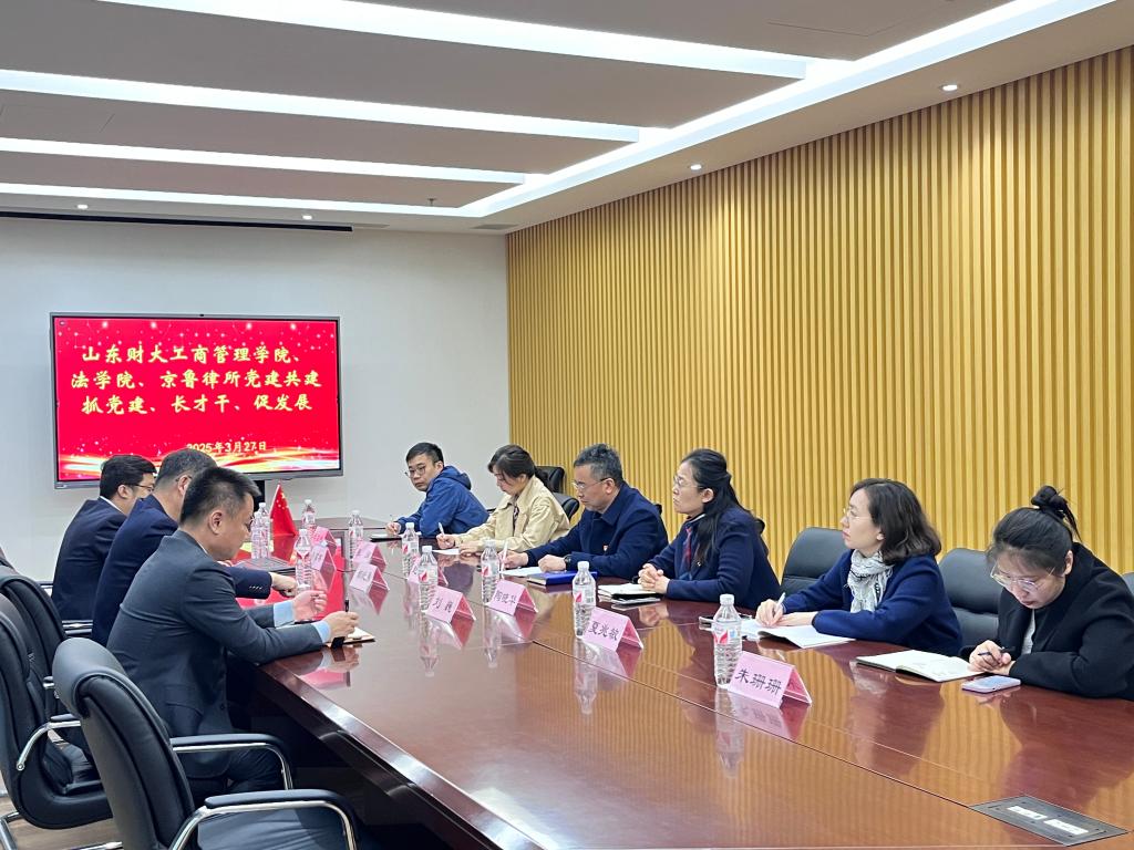 赵世民介绍了学院的历史沿革、学科建设、人才培养、社会服务等方面的发展现状,着重介绍了学院党建工作的新进展新成效,赵世民强调,学院党委持续推进“一融双高”建设,坚持以党建共建促进学科交叉融合。希望双方以此次共建活动为契机,进一步拓展合作空间,推动共同发展。郝纪勇详细介绍了京鲁律所的党建工作情况、发展历程及业务特色,展示了京鲁律师事务所党建引领业务发展的经验做法与成效。