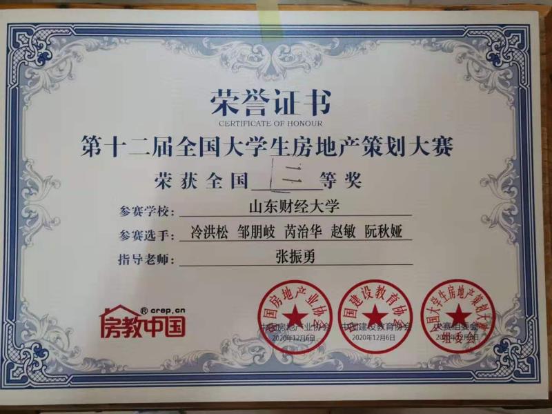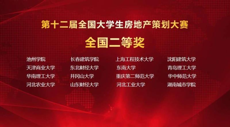在本次大赛中荣获全国二等奖的佳绩。本次大赛由中国房地产业协会指导,中国建设教育协会主办。在线上线下相结合的竞赛中,全国50家标杆房企的高管、119所高校的领导老师齐聚武汉,对174支队伍进行线上指导评分。地区不同并没有影响选手的比拼,青春活力在屏幕上生动展现。